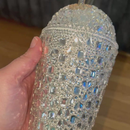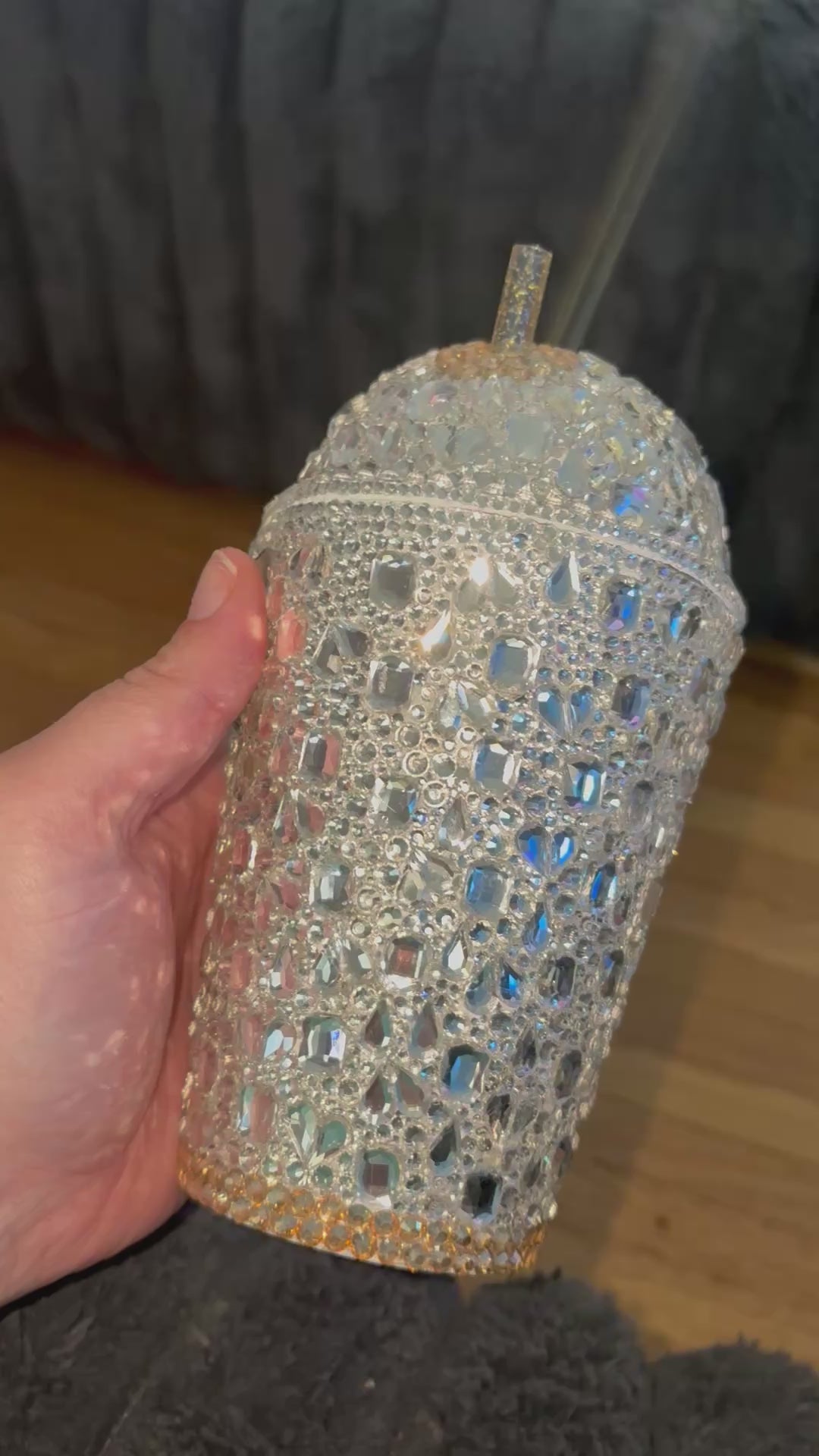 This handcrafted crystal tumbler features individually placed stones in a captivating multi-shaped design that commands attention as a statement accessory. Each piece is meticulously assembled by hand, with an elegant gold trim that elevates the aesthetic with refined sophistication. The striking composition makes it an unforgettable addition to any collection. Ready to ship within 1-2 business days, this tumbler combines artisanal craftsmanship with timeless style.